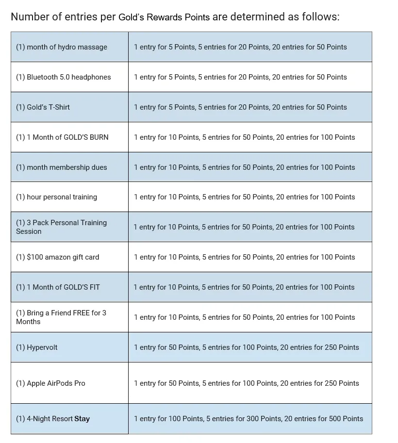 1. You may enter the sweepstakes using your own Gold’s Rewards Points via your Gold’s Rewards Account. Number of entries to the sweepstakes will be determined by the number of Reward Points used (see below chart). To use Gold’s Rewards Points, participant must be a member in good standing of Gold’s Gym SoCal Clubs. No Purchase is necessary to enter or win.